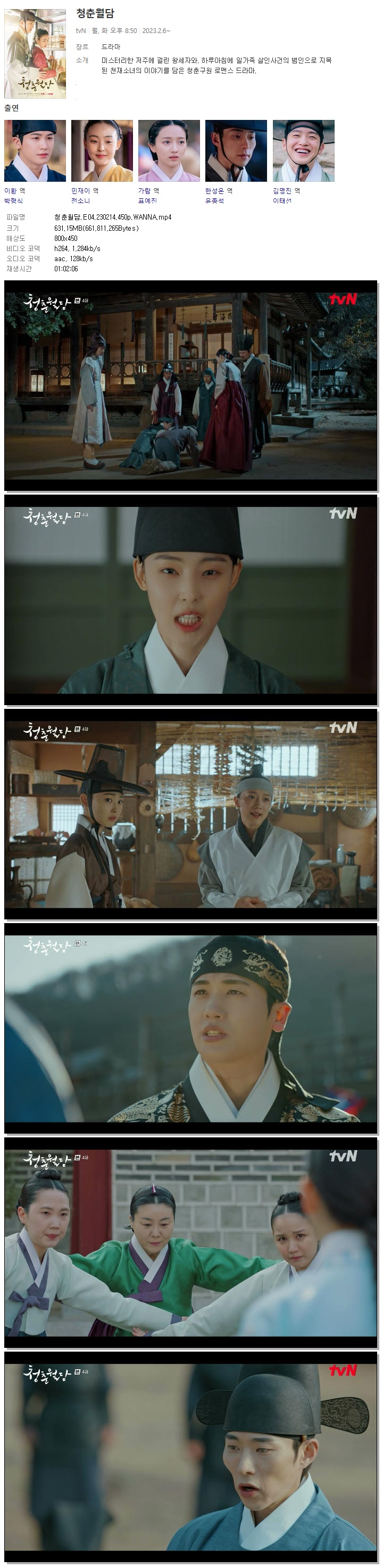 | 청춘월담.E04.230214.450p.WANNA.mp4 | 631.2 M | 01:02:06 | 800x450 |