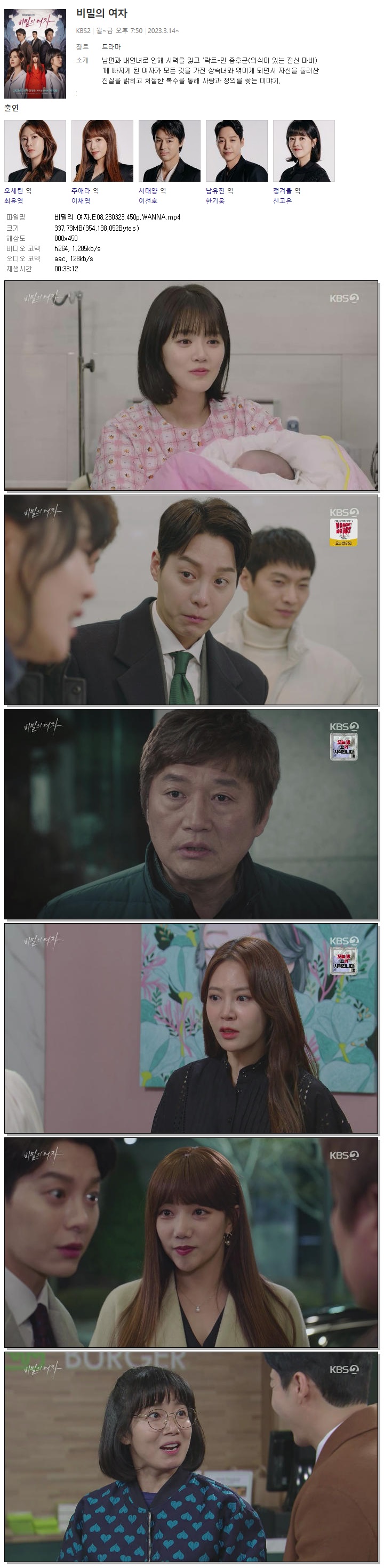 | 비밀의 여자.E08.230323.450p.WANNA.mp4 | 337.7 M | 00:33:12 | 800x450 |
