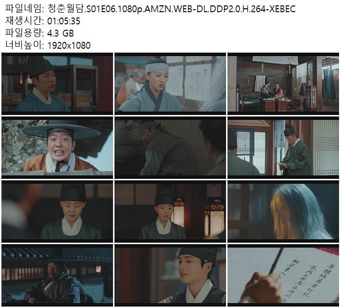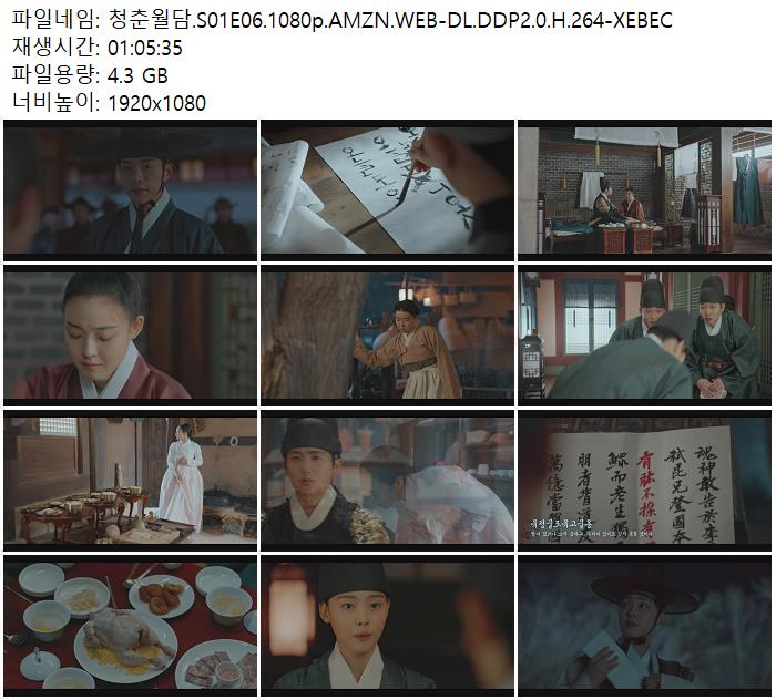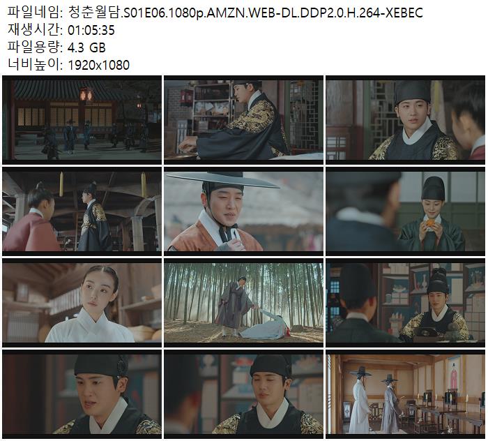 | 청춘월담.S01E06.1080p.AMZN.WEB-DL.DDP2.0.H.264-XEBEC.mkv | 4.3 G | 01:05:35 | 1920x1080 |