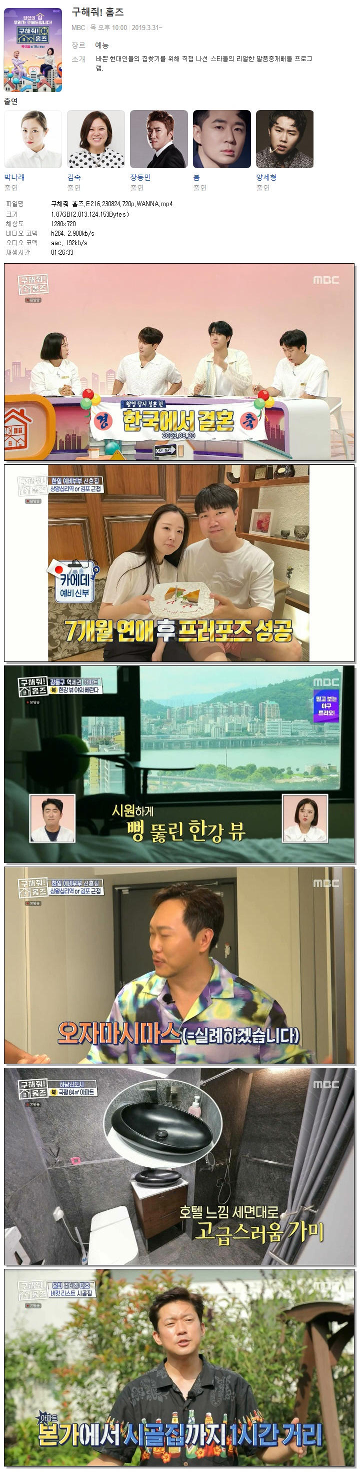 | 구해줘 홈즈.E216.230824.720p.WANNA.mp4 | 1.9 G | 01:26:33 | 1280x720 |