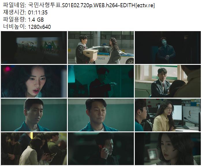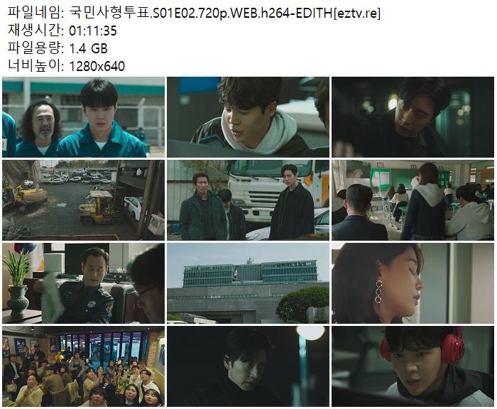 | 국민사형투표.S01E02.720p.WEB.h264-EDITH[eztv.re].mkv | 1.4 G | 01:11:35 | 1280x720 |